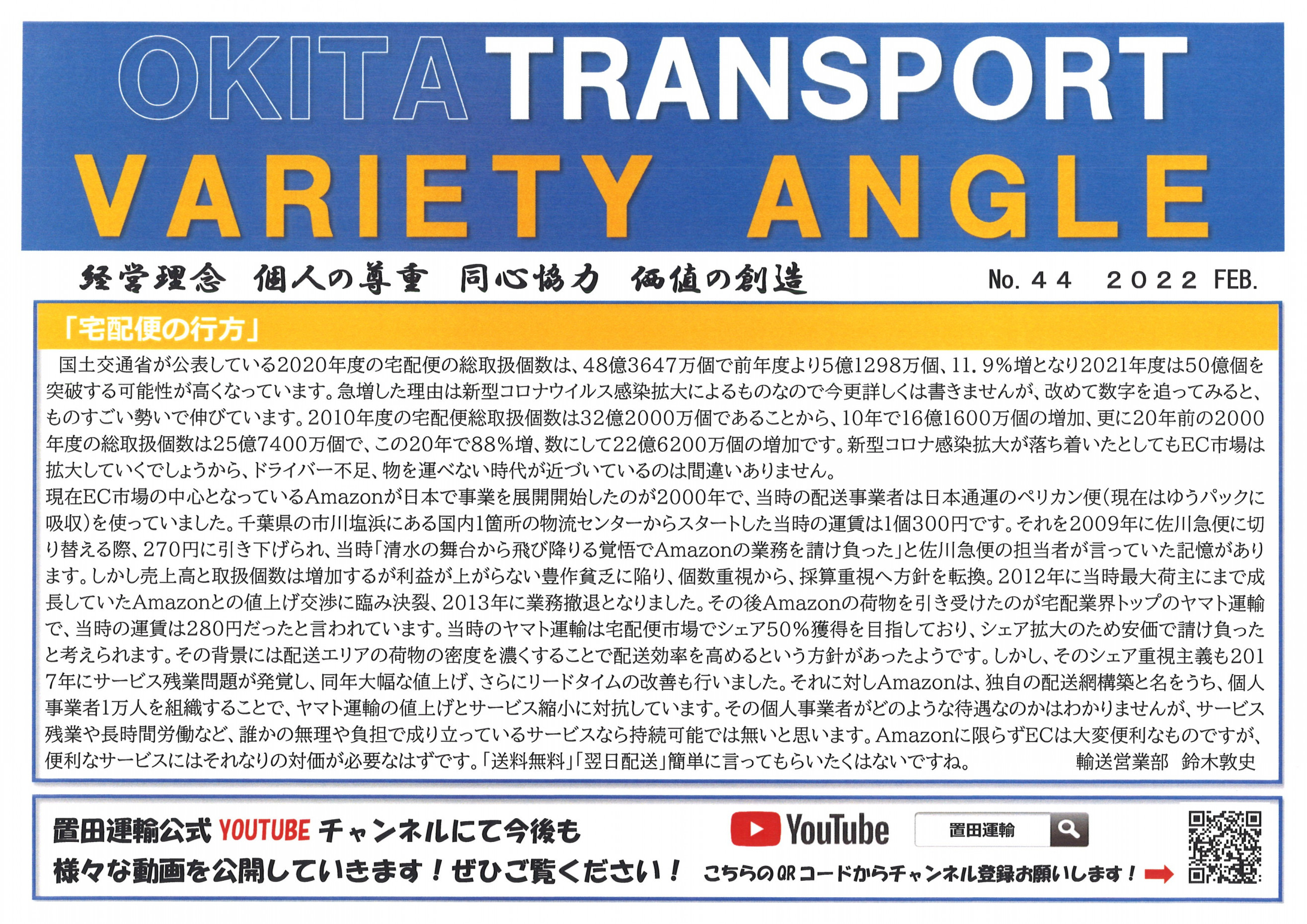 置田運輸の広報誌「OKITAVARIETY ANGLE2月号」です。