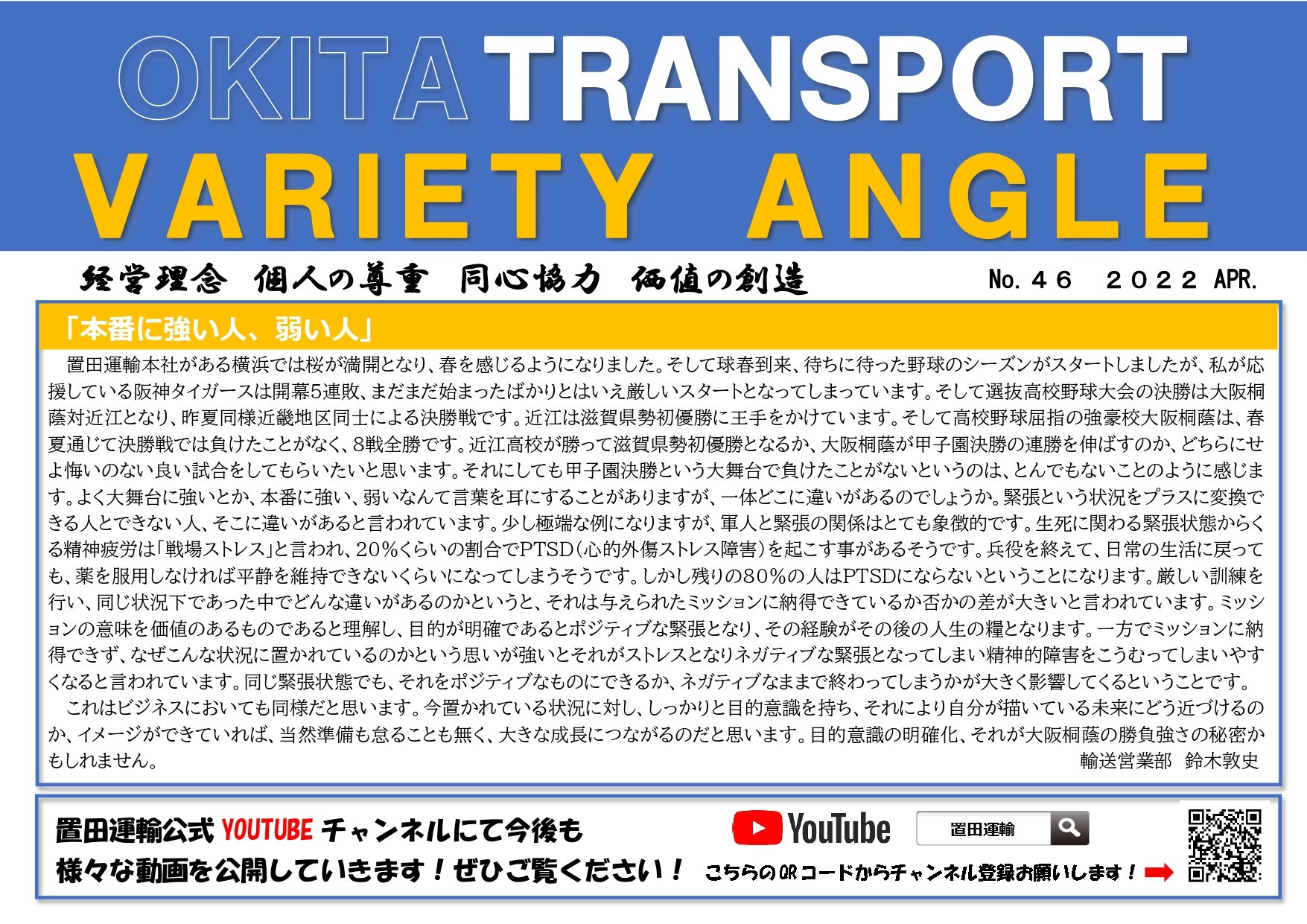置田運輸の広報誌「OKITA VARIETY ANGLE 4月号」です。