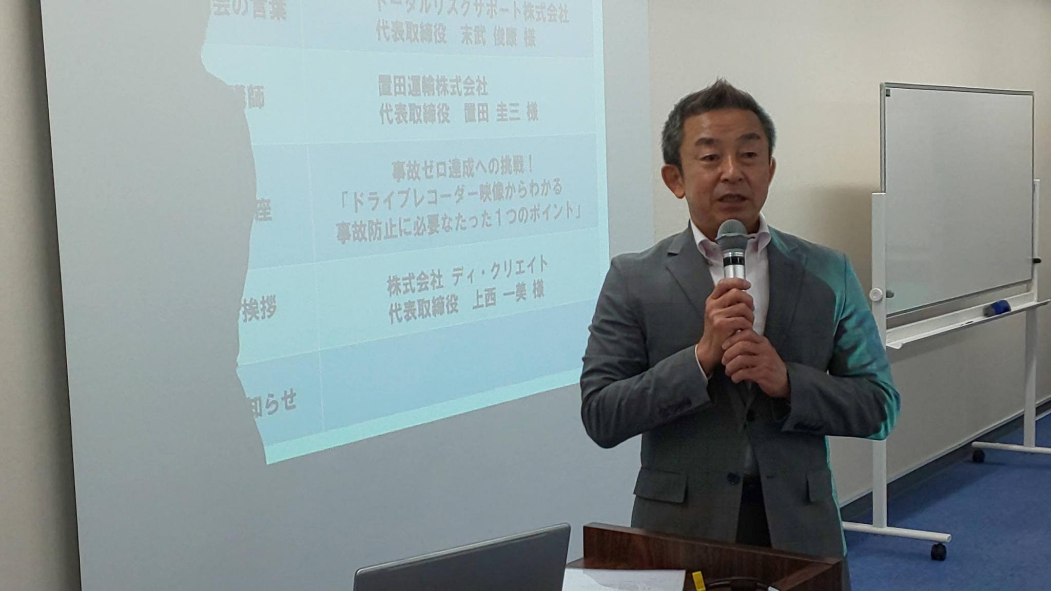 TRサポート様主催の事故防止セミナーで弊社代表の置田が講師を務めました。講演内容は顧問であるディ・クリエイト上西一美代表の監修した、「ドライブレコーダー映像からわかる、事故防止に必要なたった1つのポイント」WEB・会場参加のハイブリット研修スタイルとなりました。今後も事故防止活動を通して1件でも不幸な事故を減らす活動を行っていきます。