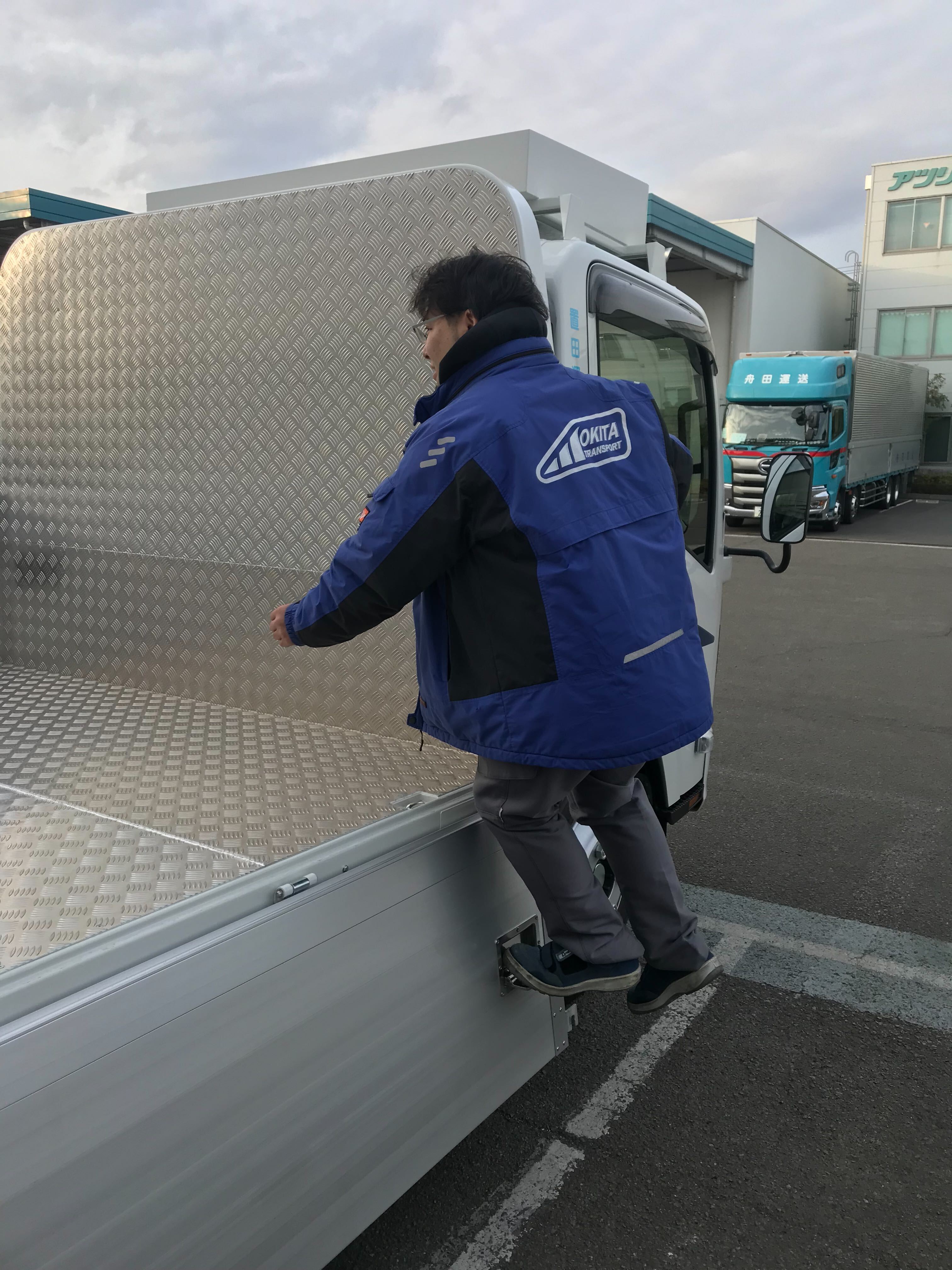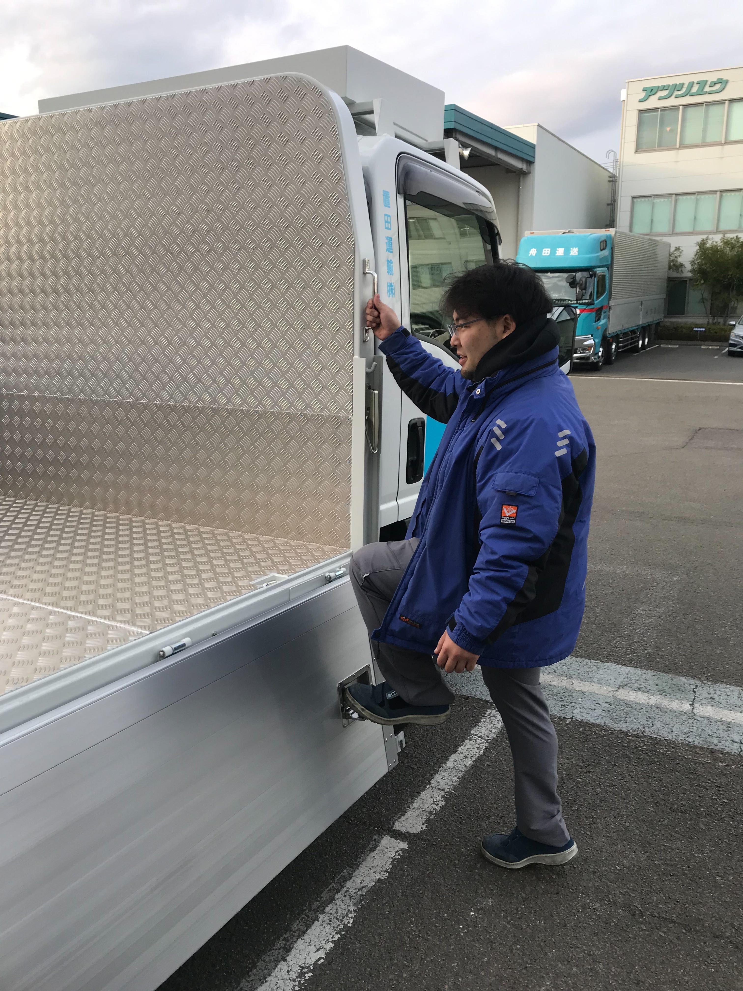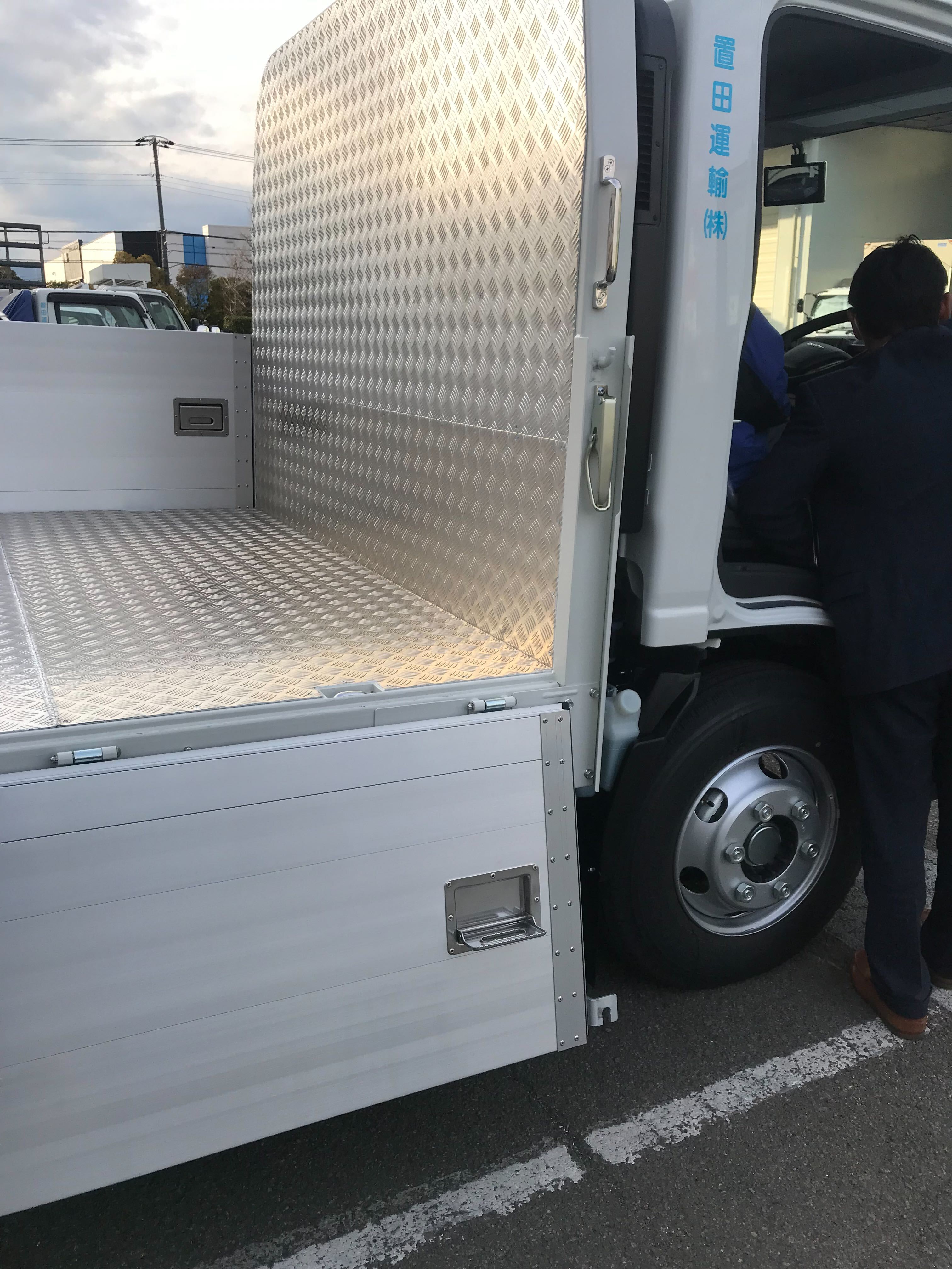 本日、平塚営業所にて納車式を執り行いました。 ISUZU 新型エルフ平ボディ4.6t積載車です。ドライブレコーダー、デジタルタコグラフをはじめ、車線逸脱警報装置、衝突被害軽減ブレーキなど安全装置も充実しています。 荷台への昇り降りの為の昇降ステップ対策車となっております。