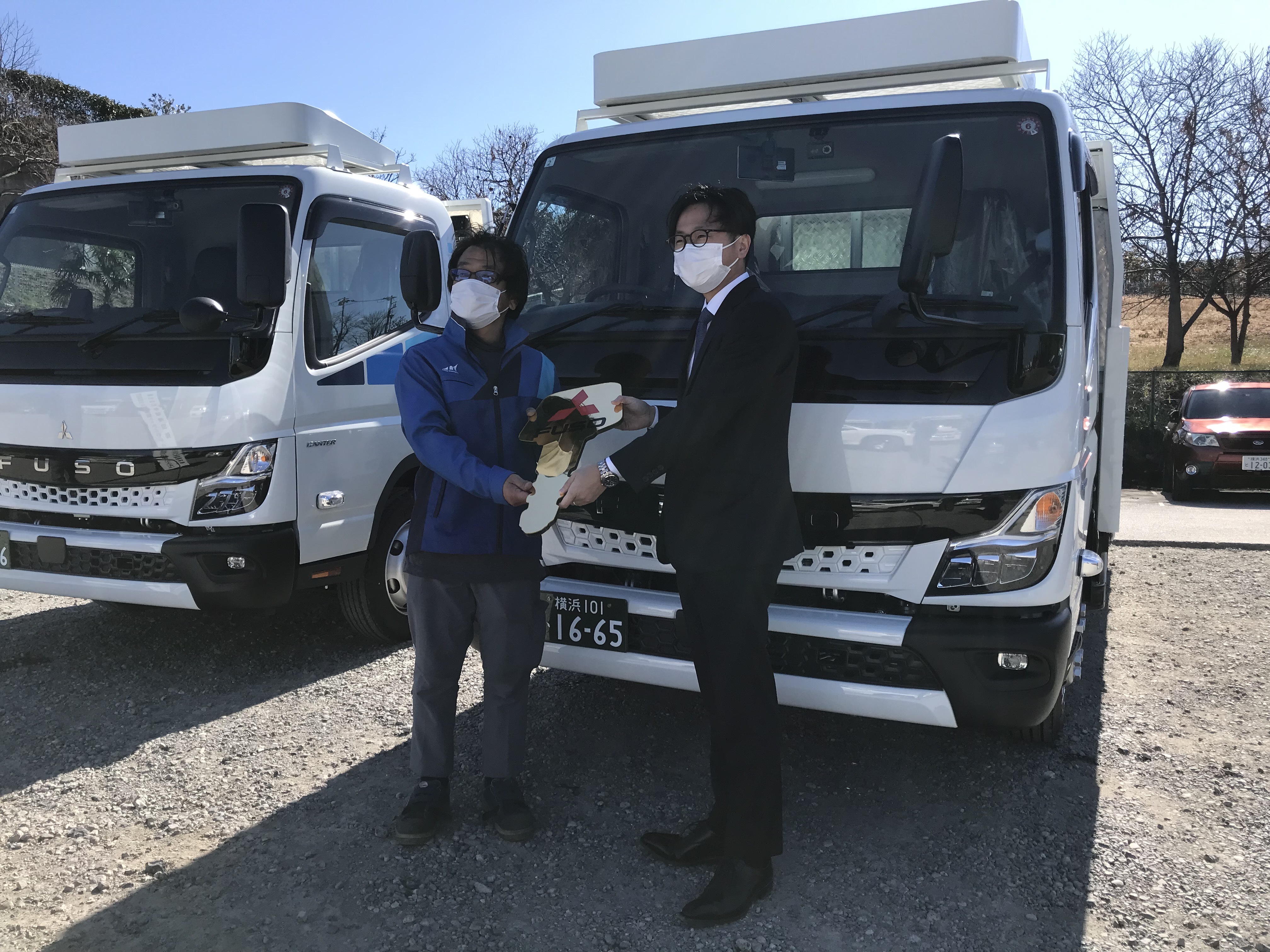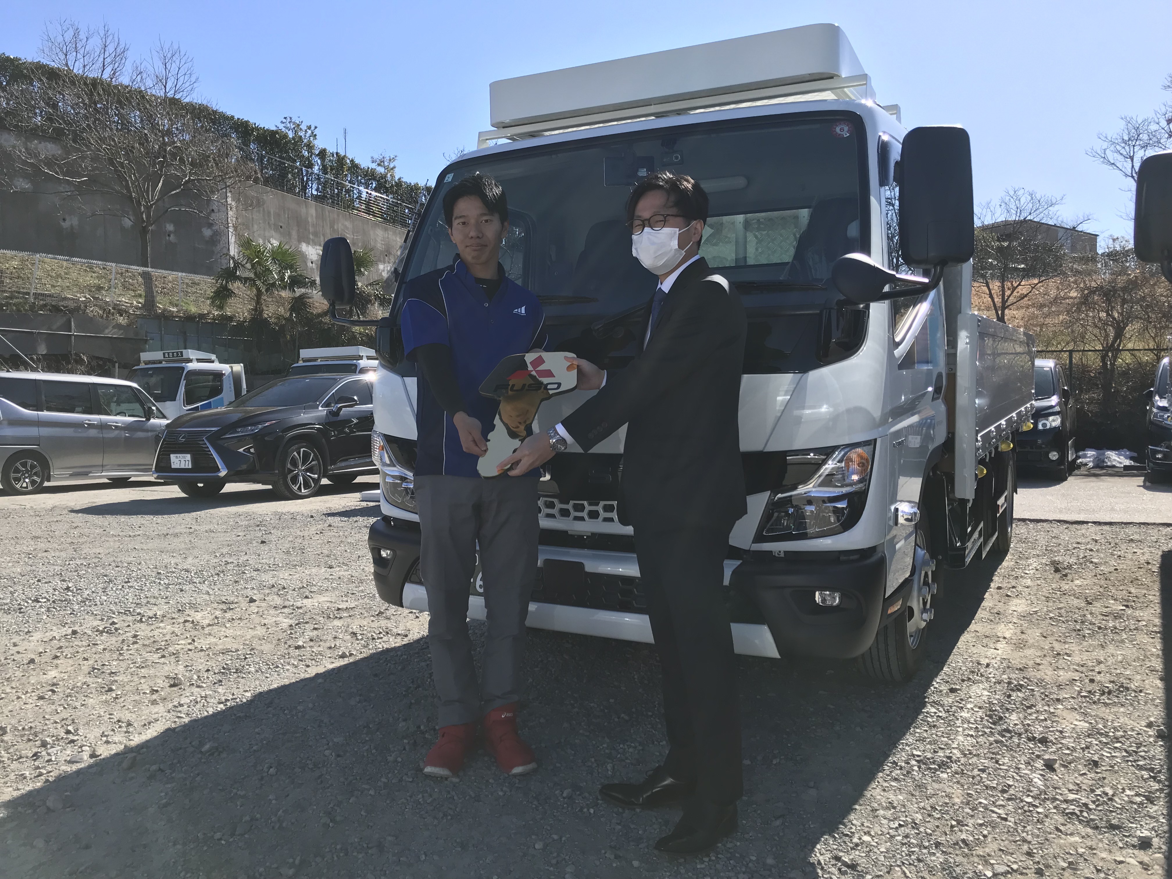 横浜営業所にて納車式を執り行いました。 三菱ふそうキャンター4t平ボディ4.8t積載車です。 ドライブレコーダー、デジタルタコグラフをはじめ車線逸脱警報装置、衝突被害軽減ブレーキ、左巻き込み防止センサーなど安全装置も、充実しております。