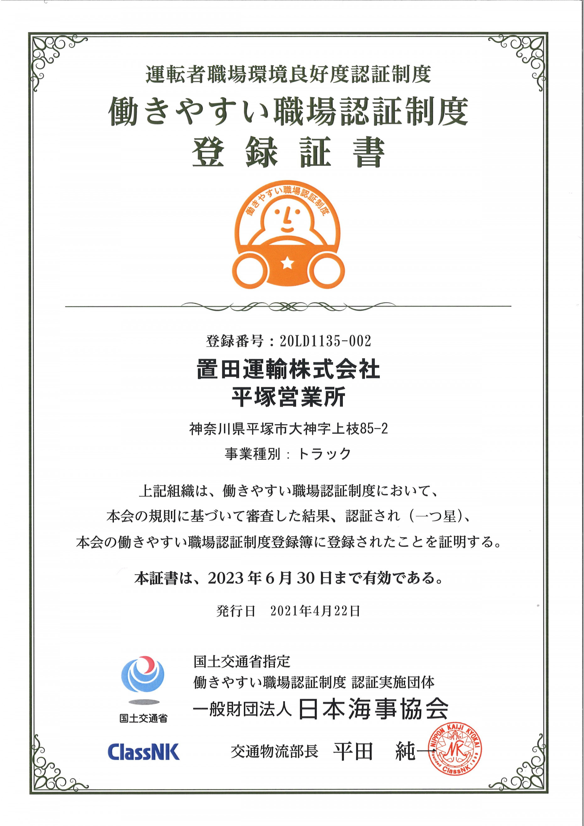 「働きやすい職場認証制度(正式名称:運転者職場環境良好度認証制度)」の【一つ星】