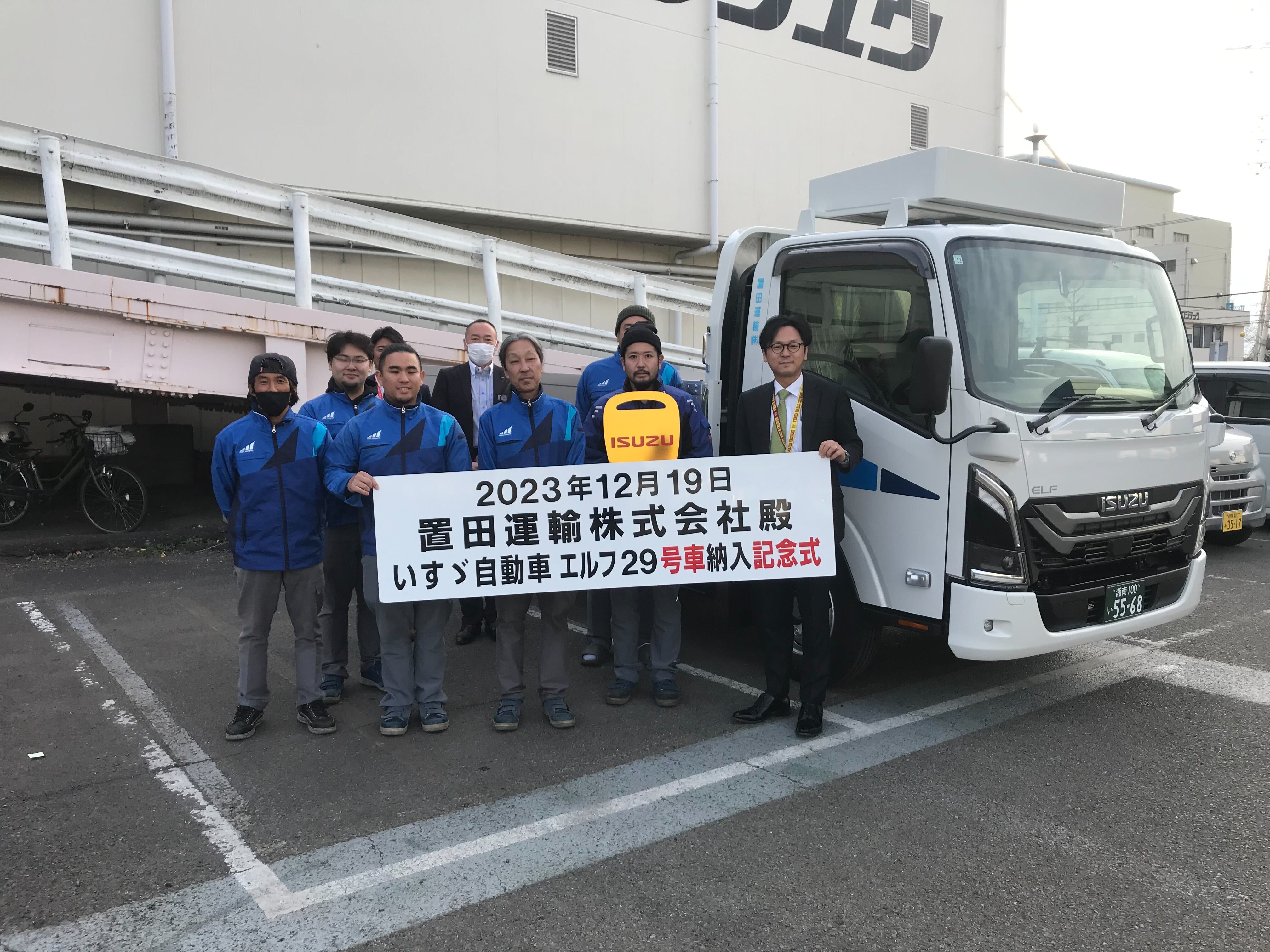 本日、平塚営業所にて納車式を執り行いました。 ISUZU 新型エルフ平ボディ4.6t積載車です。ドライブレコーダー、デジタルタコグラフをはじめ、車線逸脱警報装置、衝突被害軽減ブレーキなど安全装置も充実しています。 荷台への昇り降りの為の昇降ステップ対策車となっております。