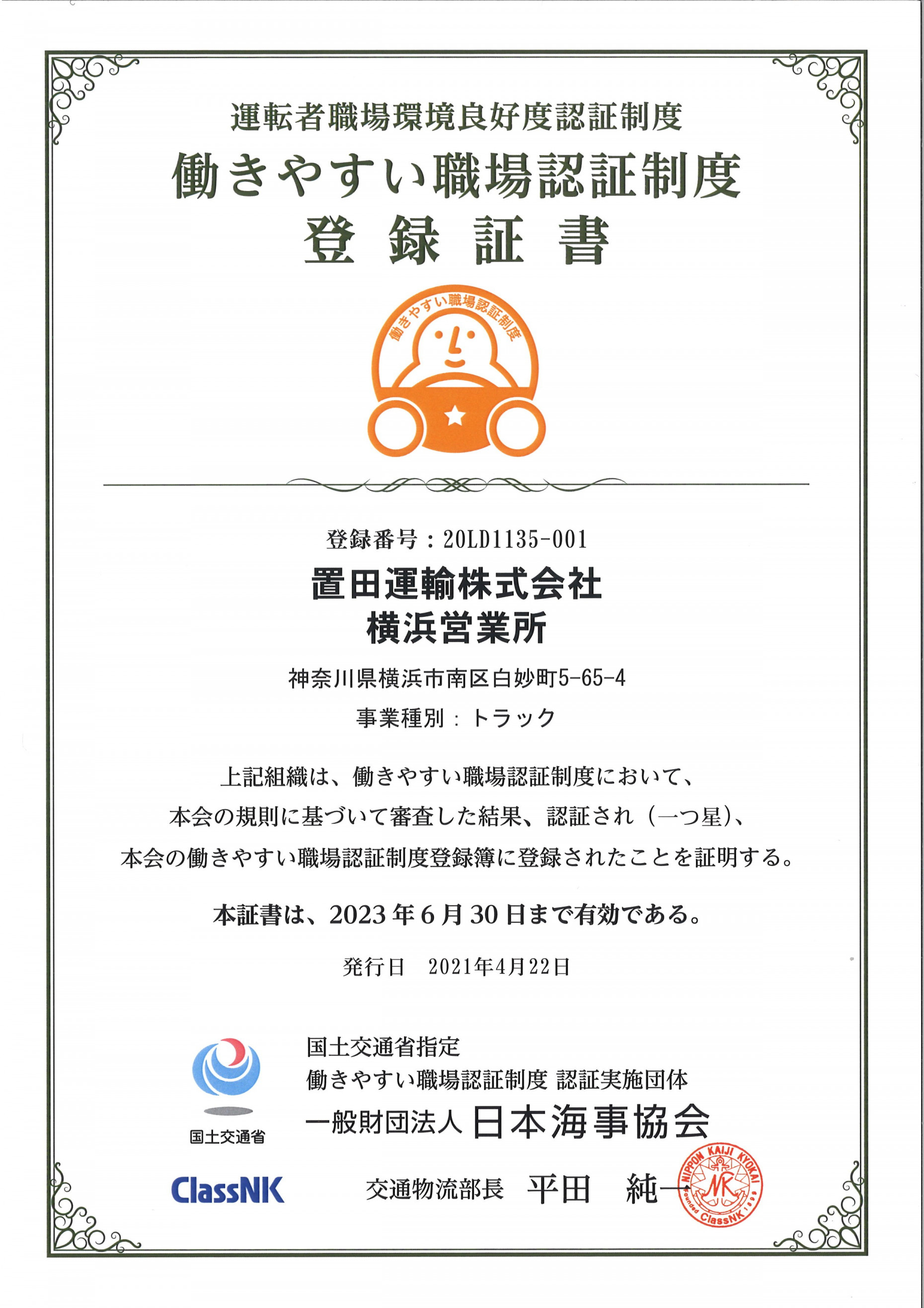 「働きやすい職場認証制度(正式名称:運転者職場環境良好度認証制度)」の【一つ星】